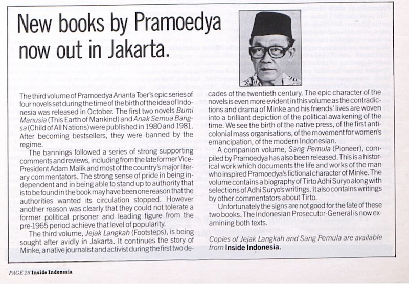 12. An interview with Pramoedya (possibly by Max Lane who edited edition 20: Oct 1989), (also in its original here) and on the Trials of Pram's publisher.