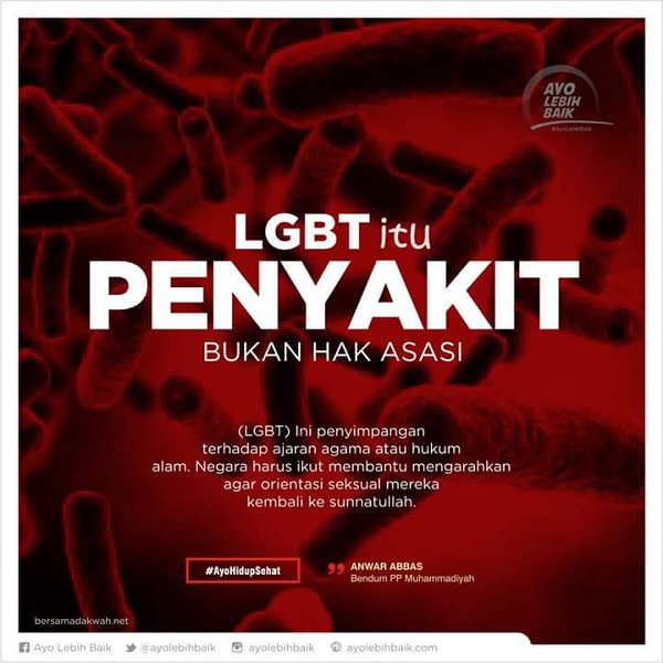 In spite of this, the press release provoked an immediate and harsh backlash. The hashtag #TolakLGBT (#RejectLGBT) started to trend on Twitter, along with posts declaring ‘LGBT itu PENYAKIT bukan hak asazi’ (LGBT is a DISEASE not a human right) and ‘LGBT bukan HAM’ (LGBT is not a human right). In response to this blowback, Komnas HAM swiftly issued a statement reassuring the Indonesian public that the commission did not approve of the legalisation of same-sex marriages.