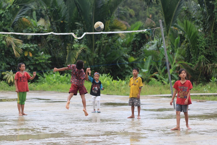 The photos in this collection show another side to the Mentawai Islands – children at play. Children slide down mud tracks into rivers, play klereng (marbles) or invent games using recycled goods. The river becomes a space of play where the life skills of using a boat and swimming become outcomes learned through play. Playing with tyres, or on boats or learning the skills of volleyball are activities far from the grandeur of Jakarta’s stadiums and the discourses of the benefits of sport as espoused by politicians. Playing is an essential element of learning, socialising and enjoying the good life.