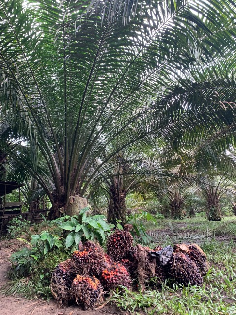 Oil palm fruit awaiting pickup by the road in an oil palm plantation.