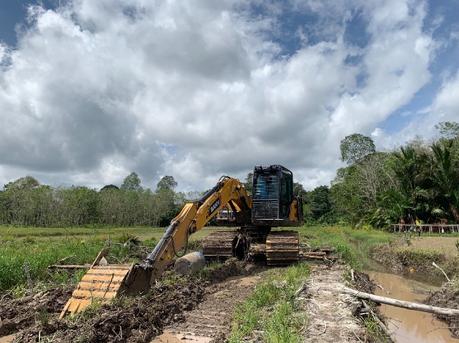 Excavator, the forest destroyer. It is used to clear large-scale oil palm plantations on the lands of the Benawan people. It cuts down large forest trees, including the increasingly scarce sagu and nsinok, to make way for oil palm cultivation.