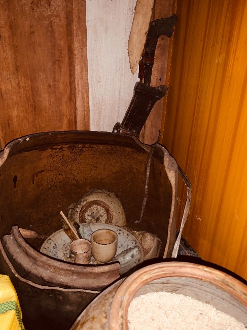 This receptacle is a rimah ngkumes adat. The offerings necessary for specific rituals such as weddings are prepared and stored here.