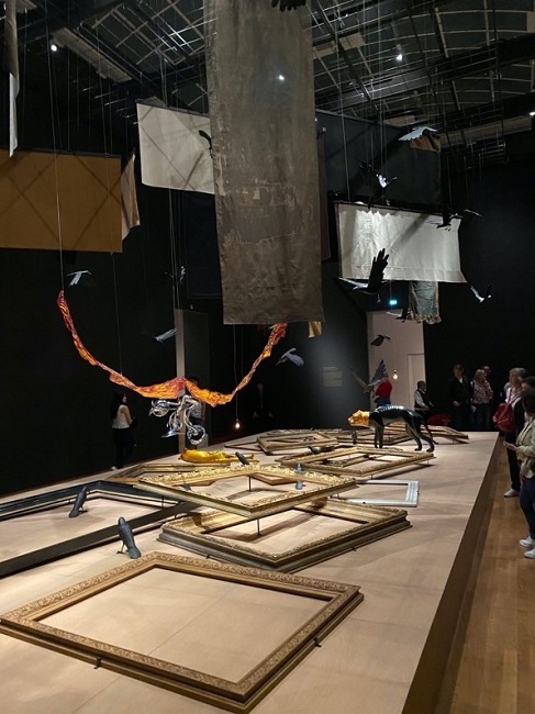 One the most beautiful and reflective aspects of the exhibition was the complex art installation by Timoteus Anggawa Kusno titled, ‘Wounds and Venom I Carry as I am Running’ (Luka dan Bisa Kubawa Berlari). The title derives from the poem ‘Semangat’ (Spirit) by Chairil Anwar. The artwork features empty frames once used to display the portraits of the former governors-general of the Netherlands East Indies. The plaques detailing the names of the artists and the former governors-general are still visible. The frames were retrieved from the Rijksmuseum collection where they have been stored since 1949. Above the empty frames that lay flat on a raised platform, hang now decaying flags of former Indonesian military units featuring kris (daggers) and prayers. Some of the symbols featured in Republican posters on display in other parts of the exhibition are also represented here, including black crows, golden tigers and silver bugles.