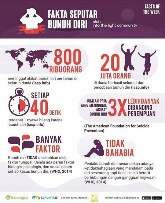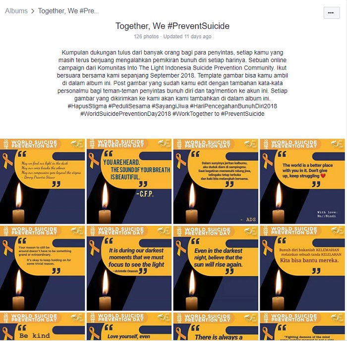 The strength of social media has been recognised by a number of community-based initiatives that promote suicide prevention and address mental health problems. At least eight community groups that provide education, advocacy and support on the issue have emerged in recent years. ‘Into the Light’ is the first inclusive, youth-driven community group that focuses specifically on suicide prevention. It was the negative effects of social stigma surrounding suicide and the little attention paid by health activists and the government to tackling this issue that inspired Benny Prawira Siauw to establish the community in 2013. Into the Light began as a Facebook page, and has since expanded to Twitter and Instagram. Currently, it has over 8000 followers on Facebook, nearly 6000 on Instagram and more than 4000 on Twitter, the majority of whom are young people. Into the Light largely focuses on raising awareness by regularly posting articles, stories, or infographics, which contain facts and information pertaining to mental health and suicide prevention. Some of the common hashtags they use are #StayAlive and #PreventSuicide.