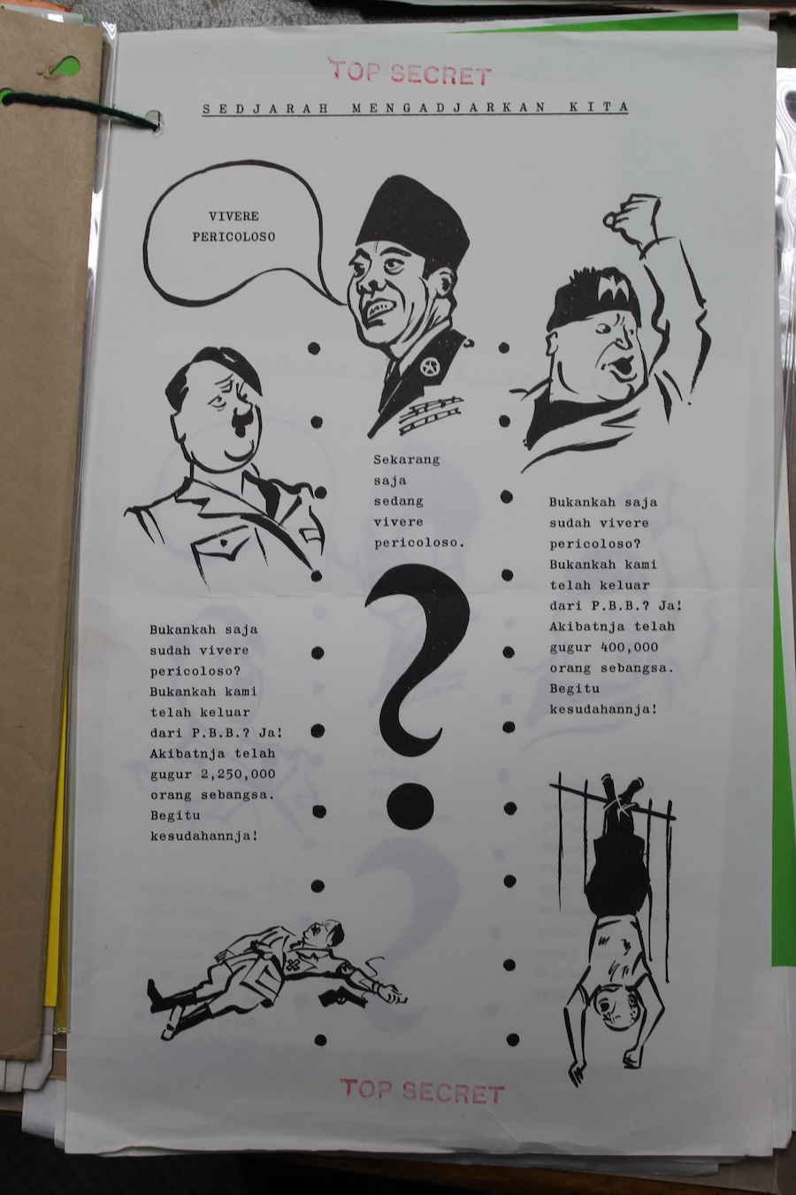 The newsletter was named Kenjataan2 (‘Facts’) and contained reportage, comment, and satirical cartoons on Indonesian current affairs by a group of fictitious regular contributors. The first copies of the newsletter were posted in April 1965, addressed to between 800 and 1500 ‘personages of influence’ in Indonesia, as well as handful of Indonesian diplomats in Europe. According to a later internal IRD report, the publication was even brought to the attention of Sukarno, although it is not known if he ever saw it, let alone read it. As to its content, it was not unlike a tabloid newspaper with virulently anti-Sukarno, anti-China and anti-Konfrontasi views – though its most inflammatory language was always reserved for the PKI.