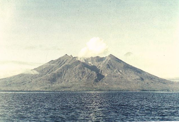 A digitised photograph of the active Makian volcano, Kie Besi. Its last major eruption in 1988 greatly damaged its surroundings. (Sumaryono/Volcanological Survey of Indonesia) |