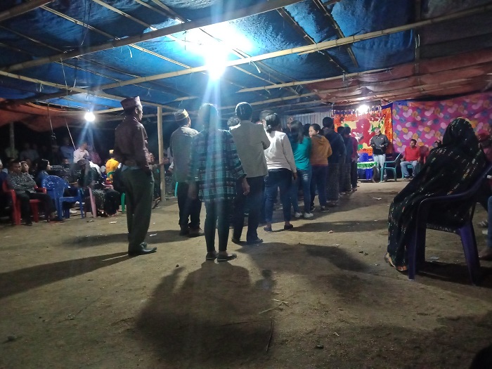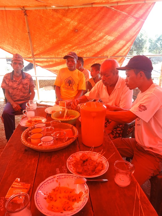 Pesta sekolah usually begin at 11 am and can last until 2 am the next morning. All guests are invited to enjoy the buffet. After, they shake hands with the hosts and their children who are about to leave the village for college. Everyone who shakes hands with the host, including small children, give over some cash. Guests can also buy additional food such as pork belly satay. A cup of palm wine costs around A$.50. The more people buy additional food and drinks, the more money the host receives. People come for food but stay into the night, dancing to songs such as Putry Pasanea’s 2019 hit entitled ‘Kaka Enda.’